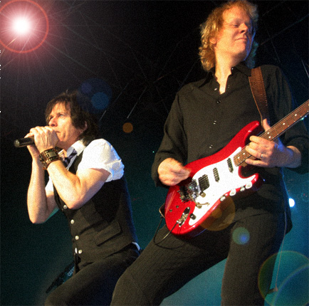 Up front, at the edge of the stage, Lawrence and JY holding nothing