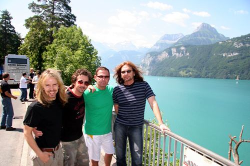 Hello Friends, This was us about three hours ago as we made our way from Zurich a little more than an hour from the Italian border. I'm not even sure of the name of this glacier fed mountain lake but it will be a long time before any of us forget just how beautiful it was. The sheer vertical cliffs, the turquoise water and the rich green trees were enough to intoxicate even the most cynical road dog. We drank in the wonderment of it all as long as we could before hopping back on the bus to make the rest of the trip, stopping at a truck stop with what has to be one of the best views of any truck stop on this planet-the jagged wall of the Alps looming like gigantic tent tops over us tiny ants looking for snacks and souvenirs. Last night at the show located close to Basil, just outside Zurich, the heat was stifling as we and every other living being did our best not to sweat, looking for any cool place to hang out before getting dressed for the show. But when that time came, suddenly the heat became our friend. We accept the fact that we will be perspiring when we perform. Even in the cooler months it's just what happens, the same way tennis players do wen they play. So we went with it, letting our muscles relax in the heat and leaning into perhaps the most energetic show of the tour so far. It was show number 5 of our final six in a row. You might think that we'd get tired and burnt after this many shows and all the traveling, but just the opposite happens. We are so legged up, so focused and have gotten so much constant cardio workout as a result, we are like a finely tuned engine that's been adjusted and tweaked after every race and in near perfect running condition. It was a bad hair night, but for every other aspect it was pure joy. We can't wait to wrap it all up with show number six tonight. Not only is it the end of the run, it's also the end of the tour as well as it being our first time to perform in Italy. As the incomparable Steve Marriott said in Humble Pie's version of "I Don't Need No Doctor," "It's been a gas, baby. It's been a gas!!! TS |