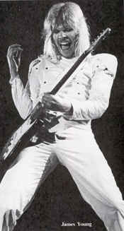 What's a mechanical and aerospace engineer with formal training on piano and clarinet doing playing lead guitar for a rock band? In James Young's case, plenty. Preferring to be called JY, he has seen Styx rise from relative obscurity to superstardom, and his electrifying Stratocaster riffs have played a critical role in the band's popularity. JY, Chicago born and bred, makes no bones about the fact he's a lead guitarist. Weaned on Hendrix, Clapton, and the soulful vibratoed blues of Albert King, he attacks his fretboard resolutely--exploring low-end sonorities one minute, then reaching for upper-register colors the next. While JY's not the fastest 6-string gun around, he can cut a mean swath through a tune if it's called for. His melodic strength, however, resides in his sustain and taste, whether he's coaxing feedback to complement Dennis DeYoung's synthesizer or harmonizing single-string passages with Tommy Shaw.