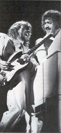 JY: It's really a great mutual admiration society between he and I. His personality and mine go well together. Tommy is from Alabama originally, and while he's just a little more laid back than I am, and maybe a little less cocky offstage, he's usually more animated during the show. But we both like the guitar, and relate to as well as appreciate many of the same things. We give each other a lot of space. For example, on records we usually try to divide the leads up as evenly as possible; onstage, kind of the same thing happens. On Pieces Of Eight Tommy said, "Why don't you play lead on 'Renegade," which he wrote. As it turned out, that was a great space for me because the song got a lot of exposure. And so on "Half-Penny TwoPenny" from Paradise Theater, which is my song, he said, "JY, I'd really like to play lead on a song like that, where I can just go out there and go wild," because he usually plays lead in the more structured tunes. When there's a real hard song Tommy says, "Well, this is JY's thing; let him do it." But we let Tommy loose on "Half-Penny." There's a lot of give and take between us, and the competitiveness you see onstage is more for the show's sake. We harbor no animosity for each other.