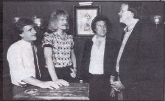 "Friday Night Videos" crew, from left: John McGhan, coordinating producer; James Young of Styx; David Benjamin, producer; and Dick Ebersol, executive producer. (Photo by Chuck Pulin)